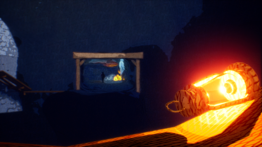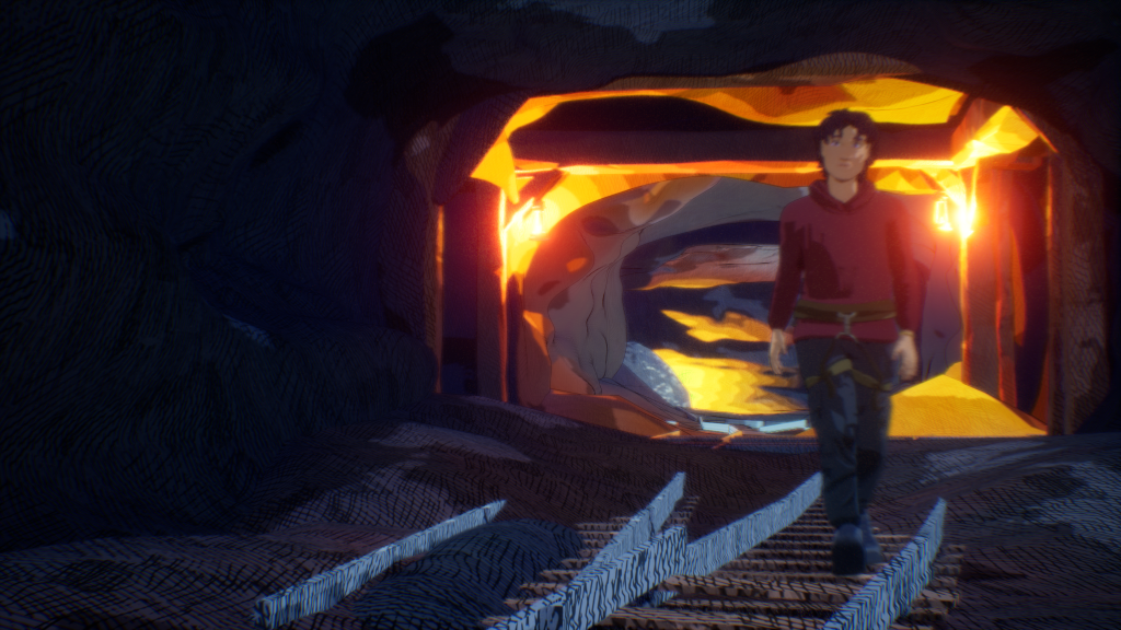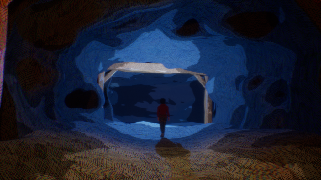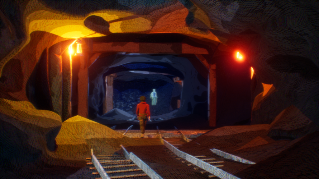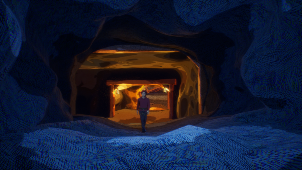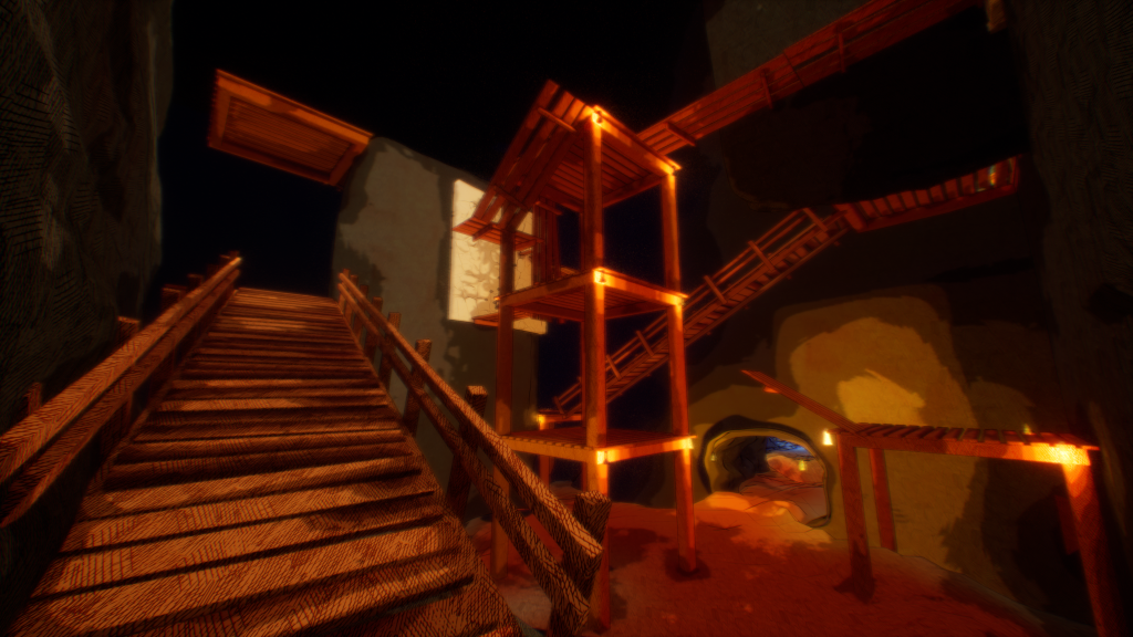 The second level is after the sun sets, it is set during nighttime though most of it is in an underground mine. The lighting for this level focuses on blues and oranges. The blue is meant to represent the supernatural nature of the surroundings while the oranges leads the player through the level with the continued warmness from the beginning.