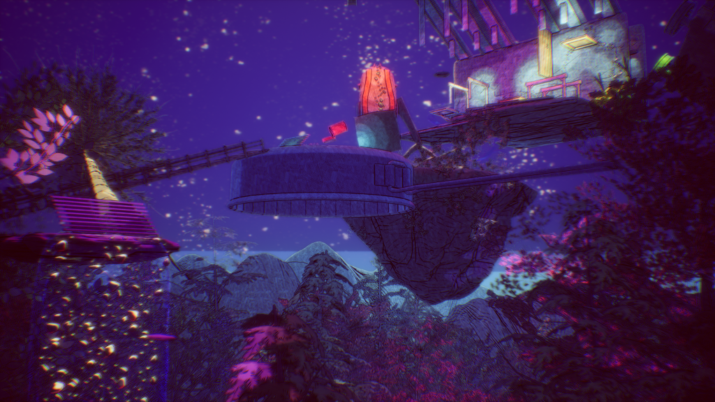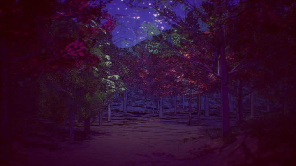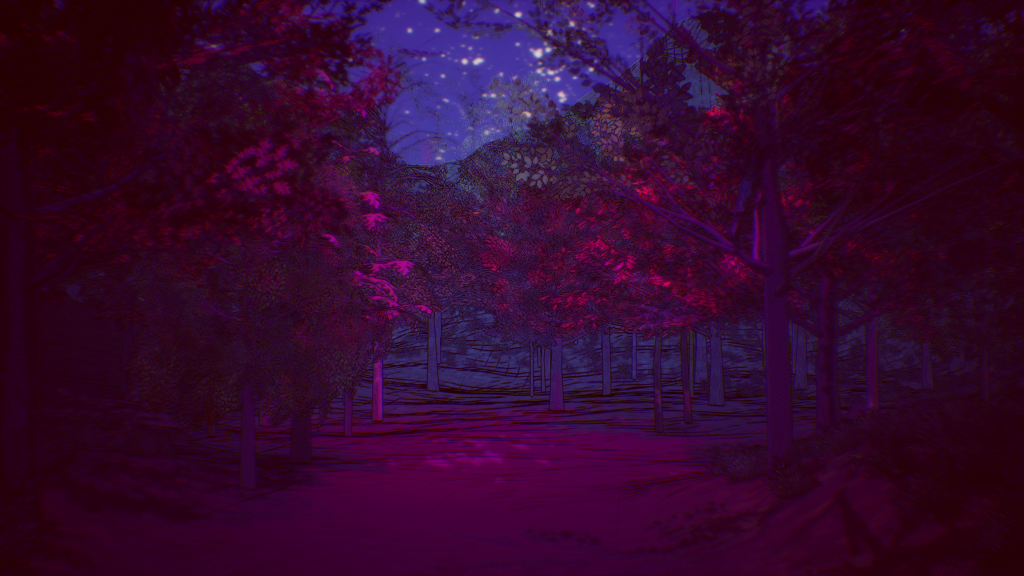 The third level is the most chaotic where the nostalgic woods gets fully overtaken by the supernatural. For this level the main colors were purple and red, with hints of bright neons throughout. While there are no more touches of the warm orange, there are a few supernatural blue lanterns scattered throughout.